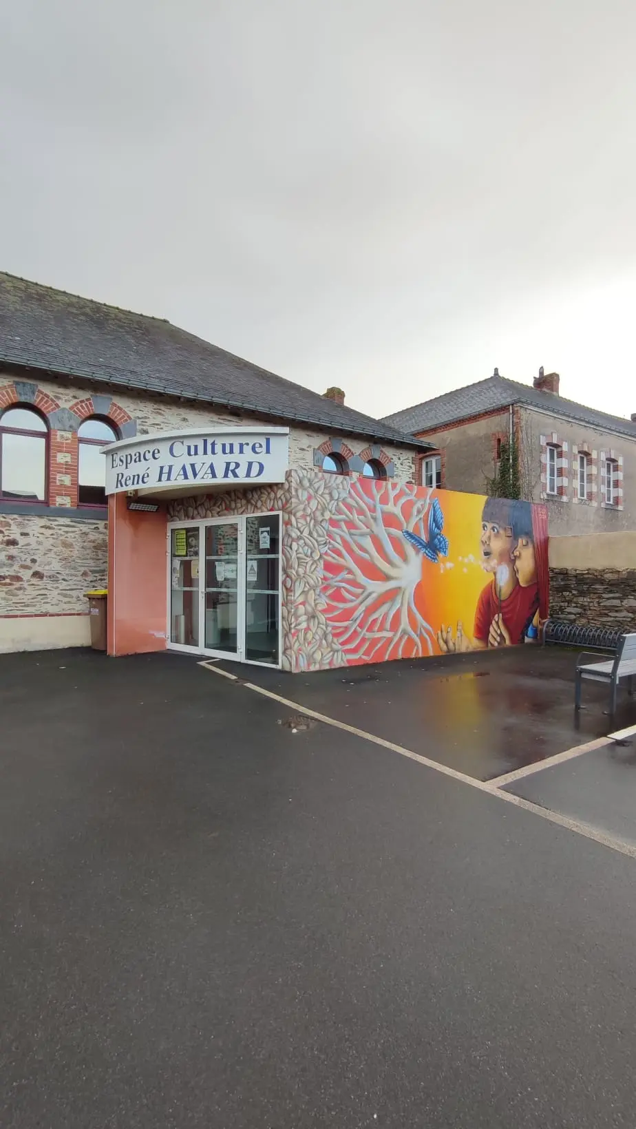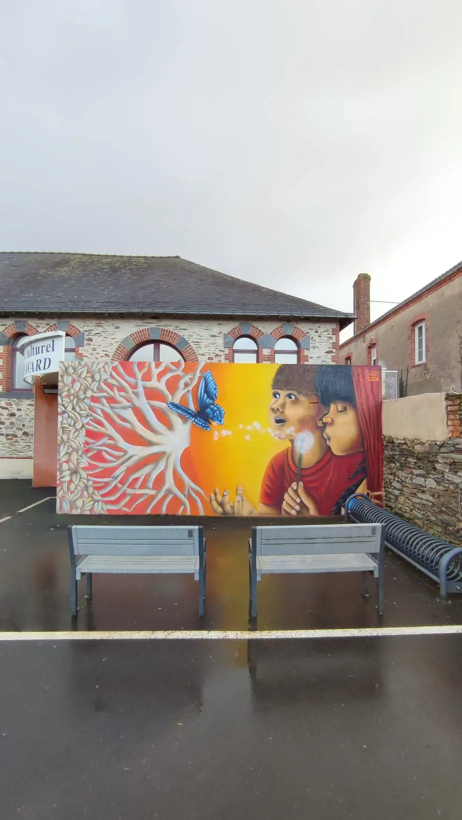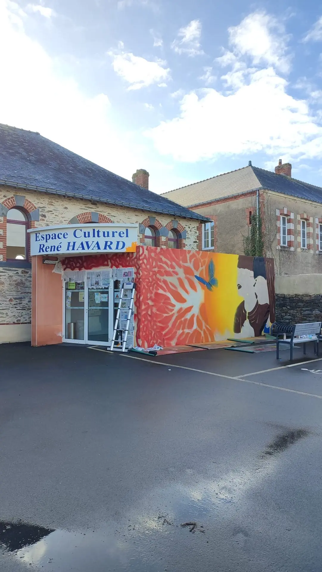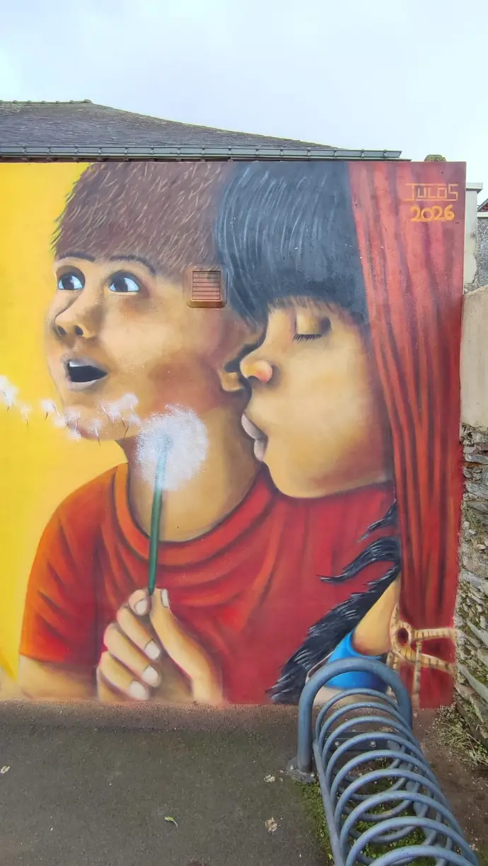 Pour donner un nouvel élan à son espace culturel, la mairie de Plessé a souhaité réaliser une fresque sur l'extension moderne qui constitue l'entrée du bâtiment. Après un travail collectif mené avec la commission culture constituée d'habitants de la commune, cette esquisse mettant en scène des enfants et un arbre est apparue.